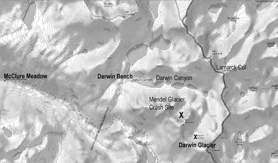 Movies - credit all files to Peter Stekel. Contact me for further explanation on the camera angle or the view. 01 Aerial view from 15,000 feet of Mendel and Darwin Glaciers 02 Aerial view from 13,000 feet of Mendel Glacier crash site 03 Mendel and Darwin Glaciers 04 Darwin Canyon Panorama 05 Mendel Cirque 06 Mount Darwin and Mount Mendel 07 Mendel Glacier from Lamarck Col [looking west] 08 Beech 18 AT-7 wheel/tire, Mendel Glacier 09 Mendel Glacier bergschrund 010 Beech 18 AT-7 engine buried in Mendel Glacier 011 Mendel Glacier Panorama 012 Darwin Canyon view of Mendel Glacier cirque in clouds |